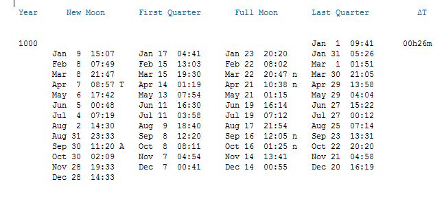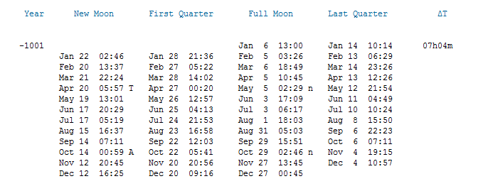 Franta: Tak teď jsem z toho jelen. Podle NASA Moon Phases je Full Moon - 301/300 n. l. 7. 1. 12:44 (New Moon 23. 1. 00:04), -1001/1000 n. l. je Full Moon 6. 1. 13:00 a - 1211/1210 je Fuul Moon 17. 1. 22:43.